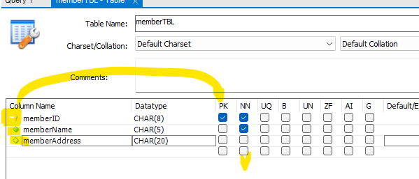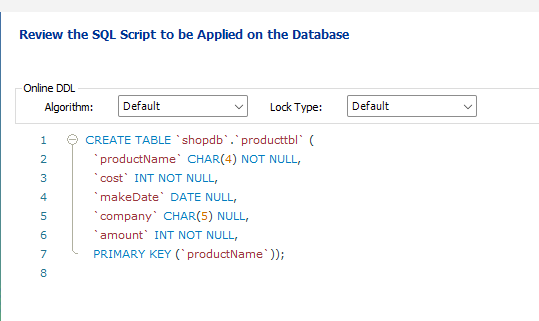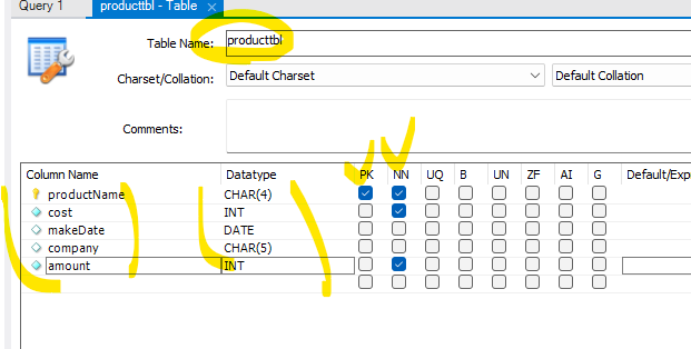 ⇒ productTBL : producttbl 테이블명을 가진 테이블을 직접 만들어보자