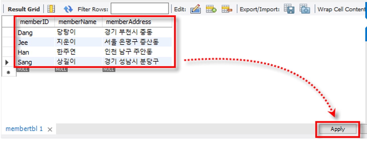 ⇒ 직접 “데이터/레코드”들을 입력하시고,,밑에 “apply”눌러보자.