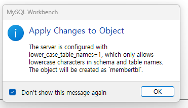 → 니가 테이블이름에 대/소문자 혼용을 했는데,,,그냥 내가 소문자로 일괄 처리해서 테이블 생성한다