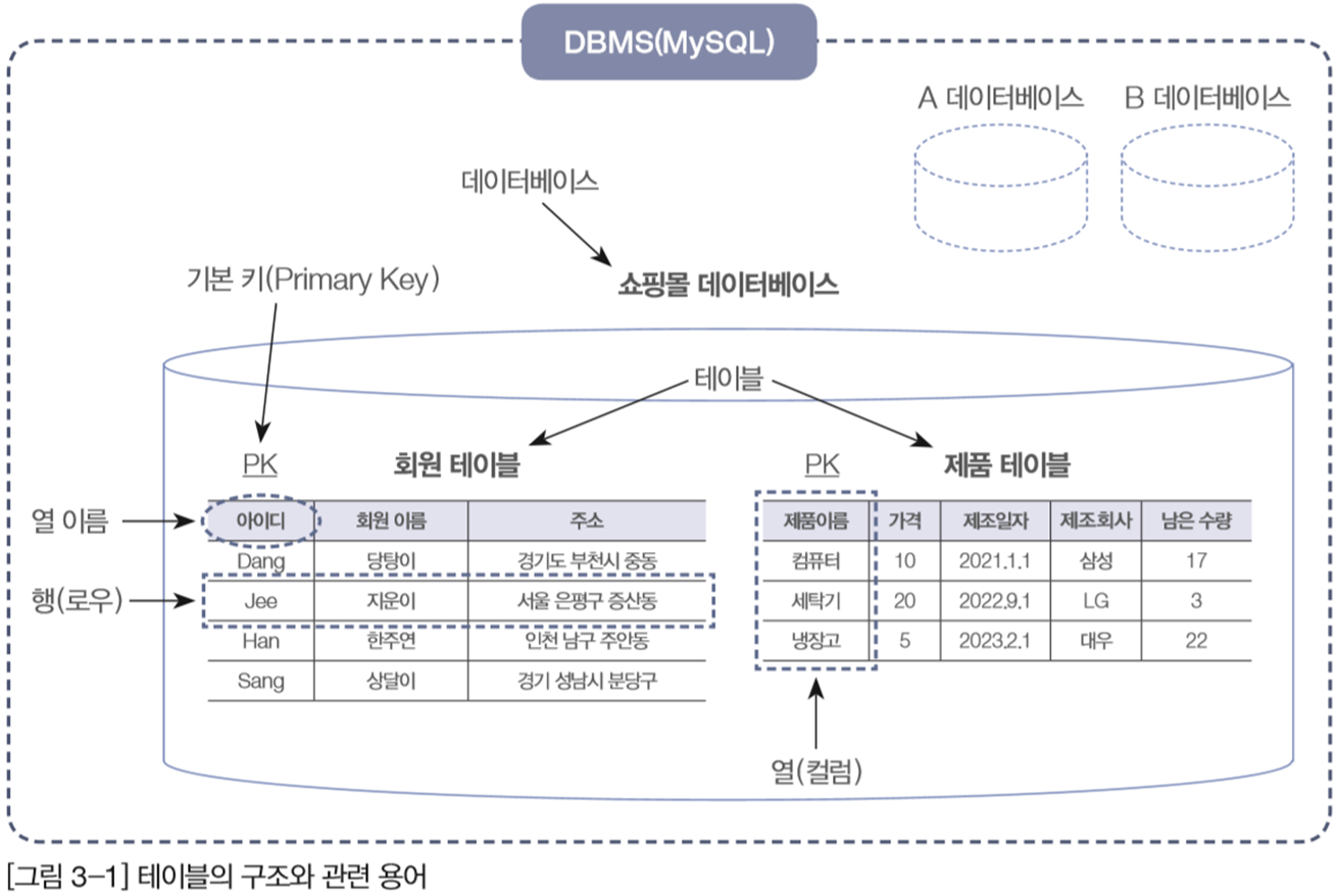 ⇒ 정리 : db → table 들을 설계( 컬럼의 특성들 ) → 데이터들을 입력/ 제거