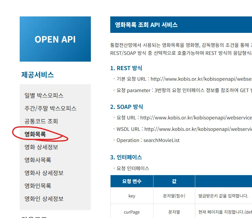 기준 사이트 페이지 : kobis api --> 영화 목록
