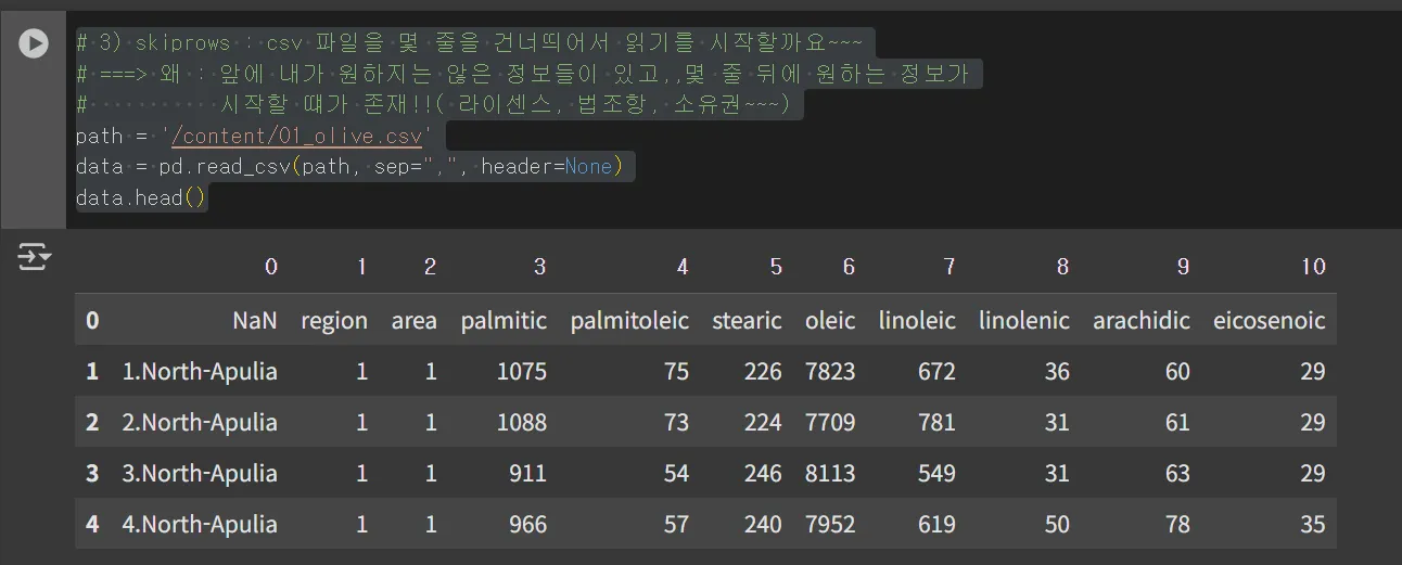# 3) skiprows : csv 파일을 몇 줄을 건너띄어서 읽기를 시작할까요~~~