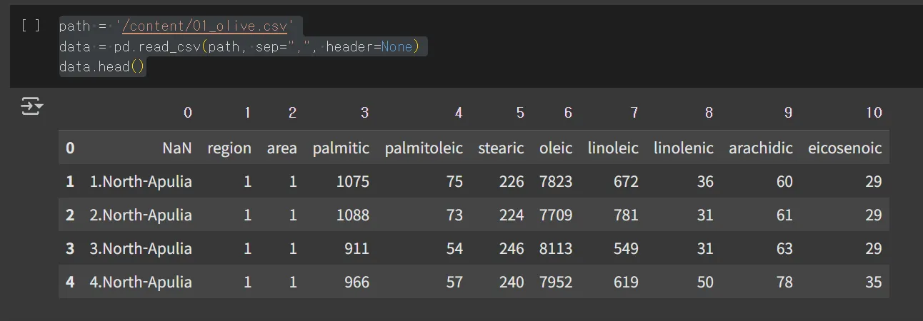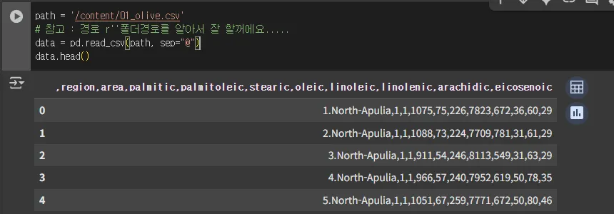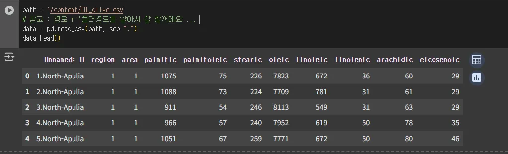 path = '/content/drive/MyDrive/0_ASAC_9기_202508/3_pandas/2_sampledata/01_olive.csv'