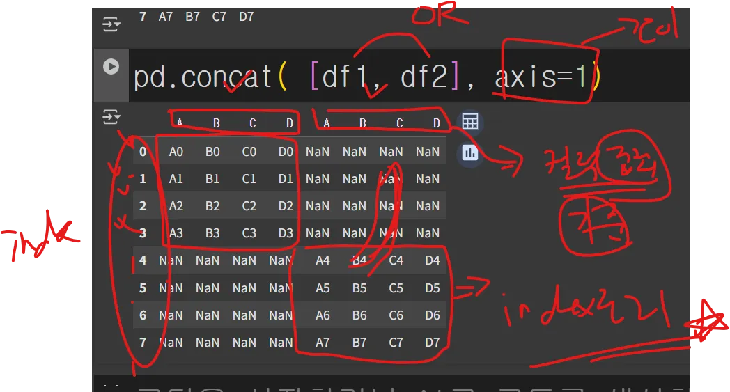 pd.concat( [df2, df1]) # --> 합칠 대상들을 순서대로 합쳐주는 역할!!!