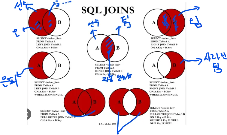 exclusive join : sql에서도 따로 명령어 없음 ⇒ where 사용해서 → where ~~ is null