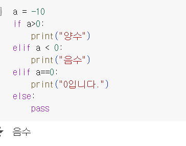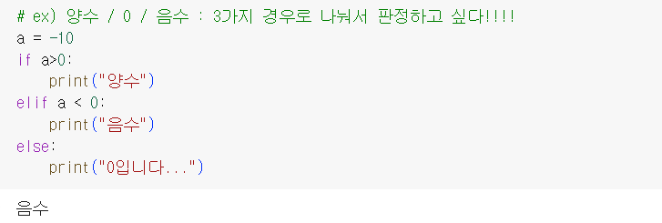 a = -10 if a > 0: #조건을 만족할 때 tab 들여써서 할 일 작성 print("양수입니다.") else: print("0 또는 음수입니다.") - 양수 / 0 / 음수 : 3가지 경우로 나눠서 판정하고 싶다