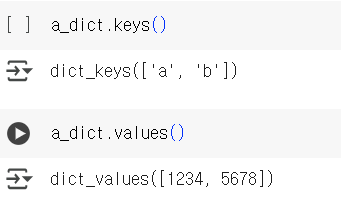for i in a_dict: print(i) #키값만 출력 a, b, c for i in a_dict.keys(): print(a_dict[i]) #밸류값 출력 for i in a_dict.values(): print(i) #밸류값 출력 #########에러는 안 나는데 키값을 중심으로 돈다 - dict (키, 밸류 같이 돌리면 안 돼?)