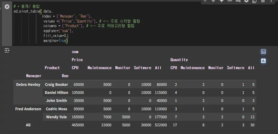 → 팀장이 팀원들의 매출액을 잘 관리를 하는지 보자