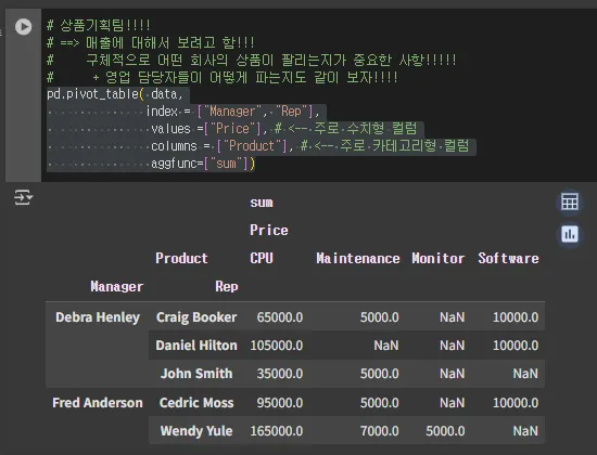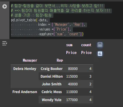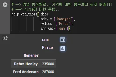 # --> 영업 팀장별로,,,가격에 대한 평균보다 실제 매출!!!