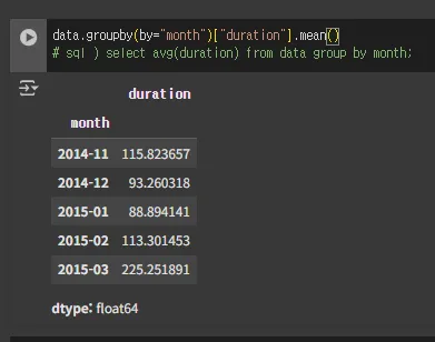 data.groupby(by="month")["duration"].agg("mean") # FM
