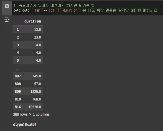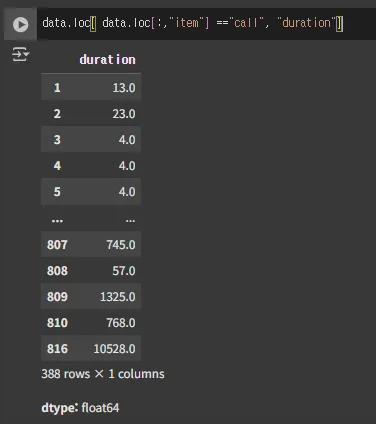 data[data["item"]=="call"]["duration"] ## 얘도 위랑 결론은 같지만 최대한 피하세요!