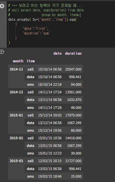 - sql ) select first(date), sum(duration) from data group by month, item;