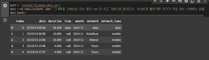 data = pd.read_csv(path, sep=",") #뭐로 구분되는 지는 일단 sep 안 쓰고 기본으로 넣었다가, 이상하게 들어가면 자기가 직접 찾는 수밖에는 없음