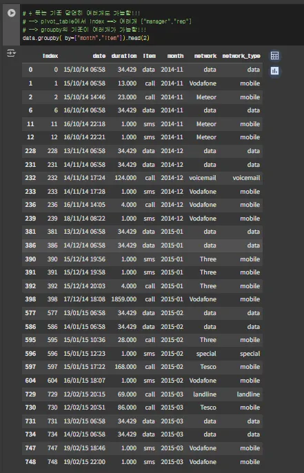 item의 항목이 call인 경우에 한해서(전화통화) ⇒ network 통신사 별로 duration 총 합을 보자 ⇒ 통신사별로 전화 사용에 대해서 차이가 있는지