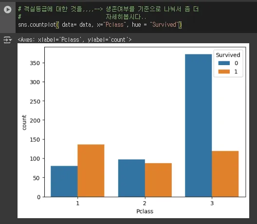 - 오른쪽 : 객실별 생존자/사망자 수 → seaborn → countplot