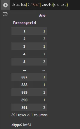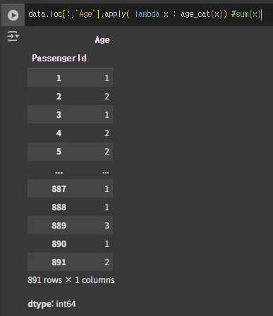 data.loc[:,"Age"].apply( lambda x : age_cat(x)) #sum(x)