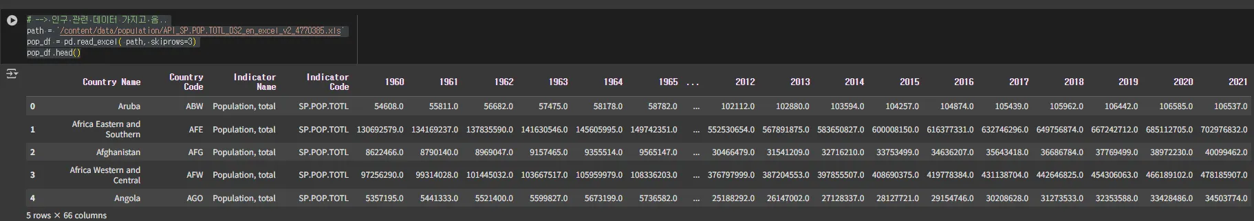 - 추가 데이터 : 나라별로 인구데이터를 같이 보자(외부 다른 소스에서 찾아서 ) https://data.worldbank.org/indicator/SP.POP.TOTL?end=2021&start=1960&view=chart