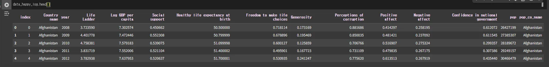 - data_happy_log에 pop 컬럼을 추가해서 월드뱅크 인구 데이터를 가져다 붙이기